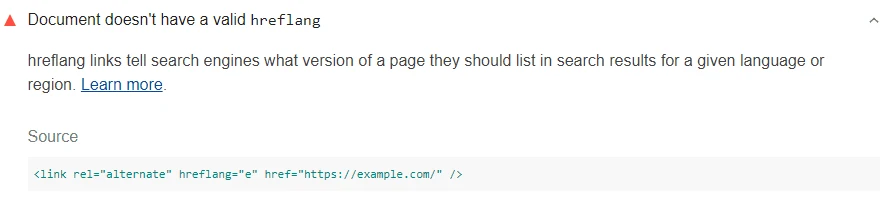 Sau đó, Lighthouse sẽ kiểm tra mã ngôn ngữ hợp lệ trong các đường liên kết hreflang. Lighthouse báo cáo mọi đường liên kết hreflang có mã ngôn ngữ không hợp lệ.
