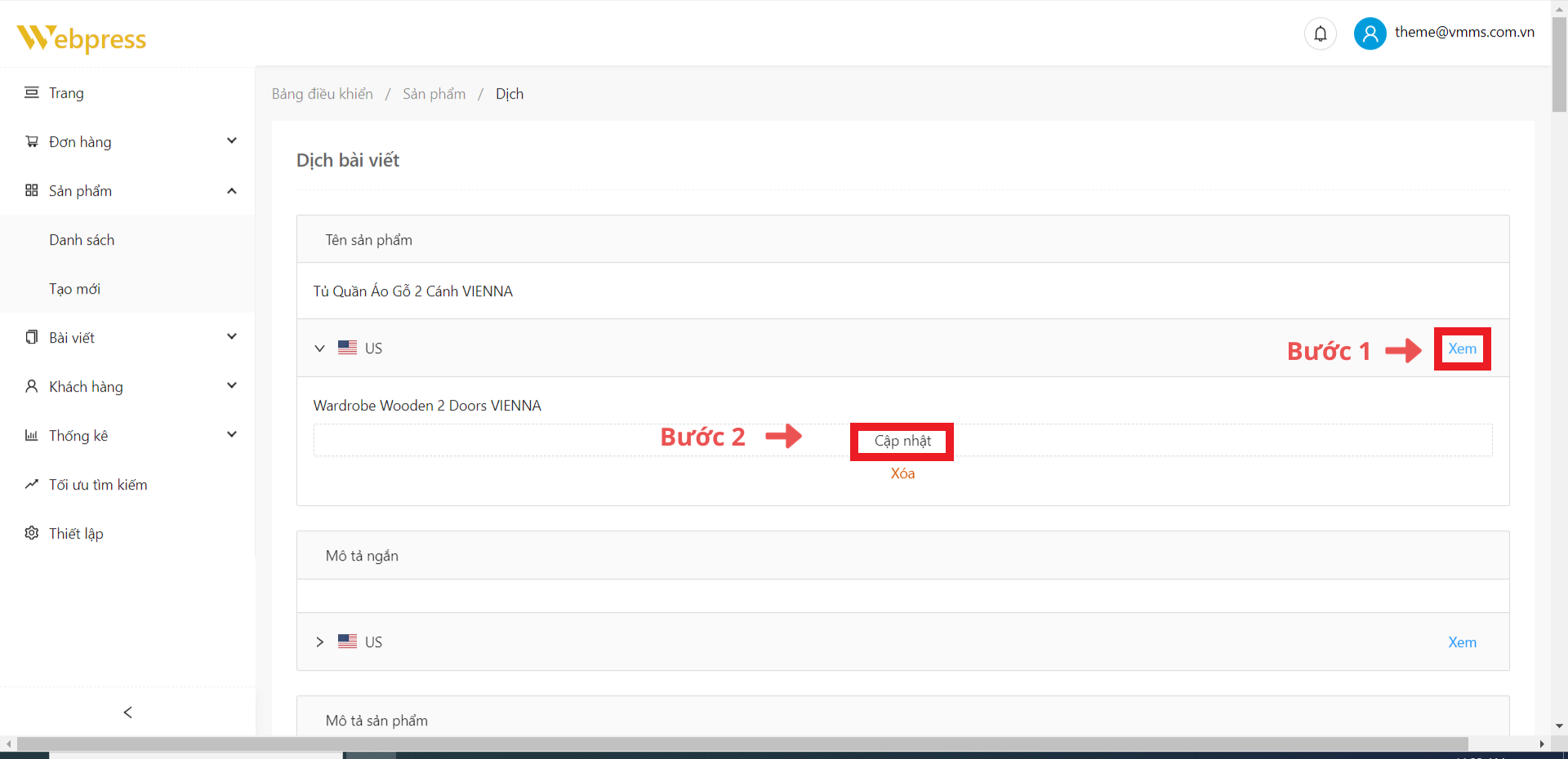 Bước 1: Ở danh sách sản phẩm, chọn sản phẩm muốn thêm ngôn ngữ và click vào icon “Bản dịch”