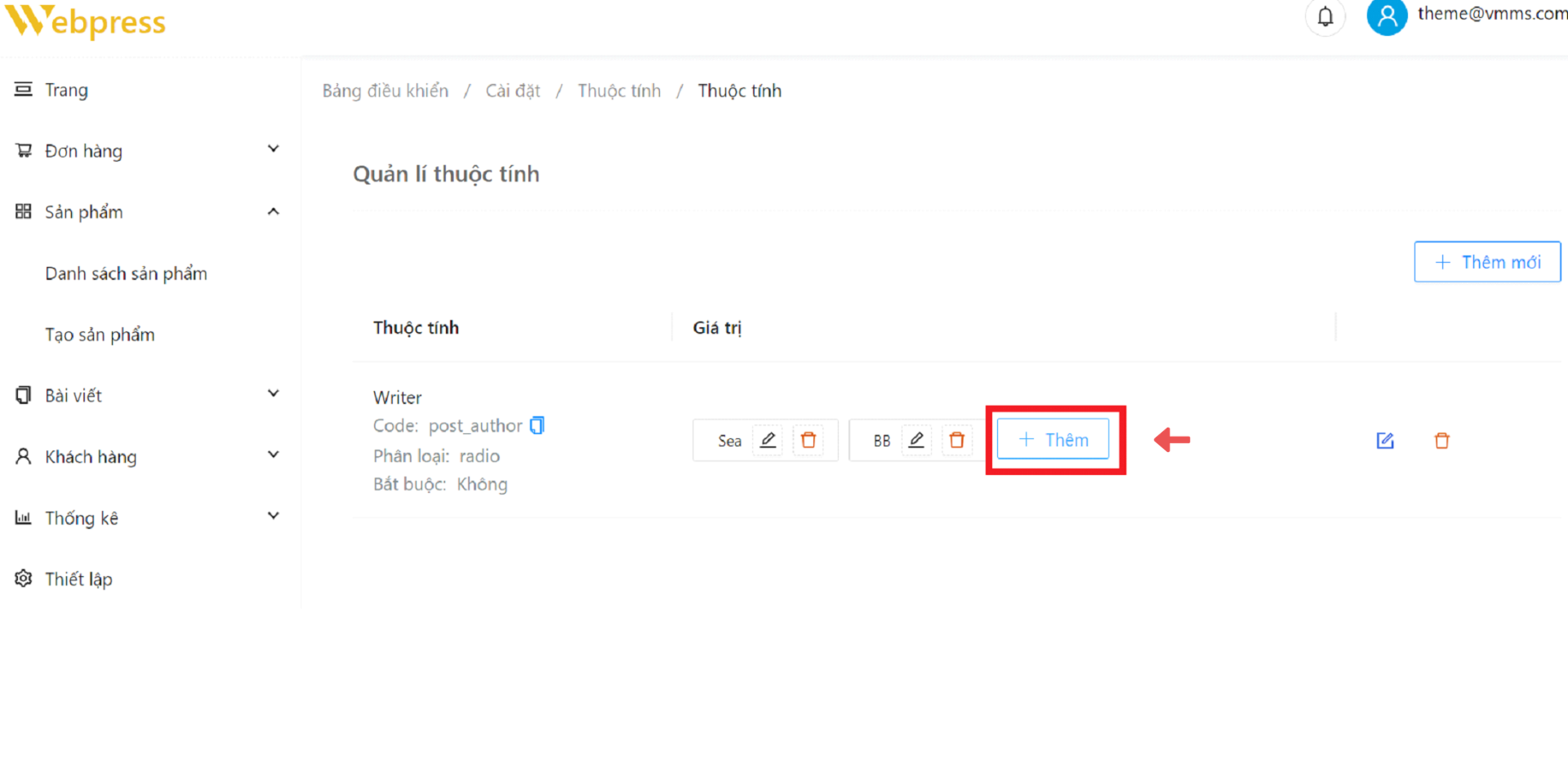 Bước 4: Sau khi thêm thuộc tính, chọn “Thêm” ở thuộc tính muốn thêm giá trị