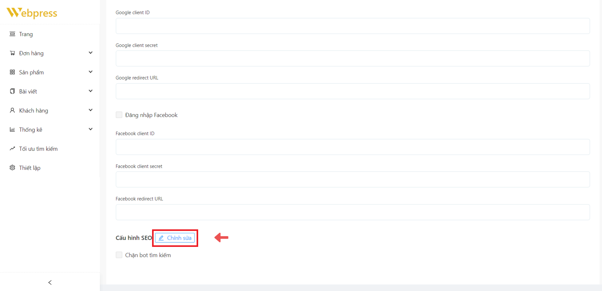 Bước 4: Mục “Cấu hình SEO” -> chọn “Chỉnh sửa”