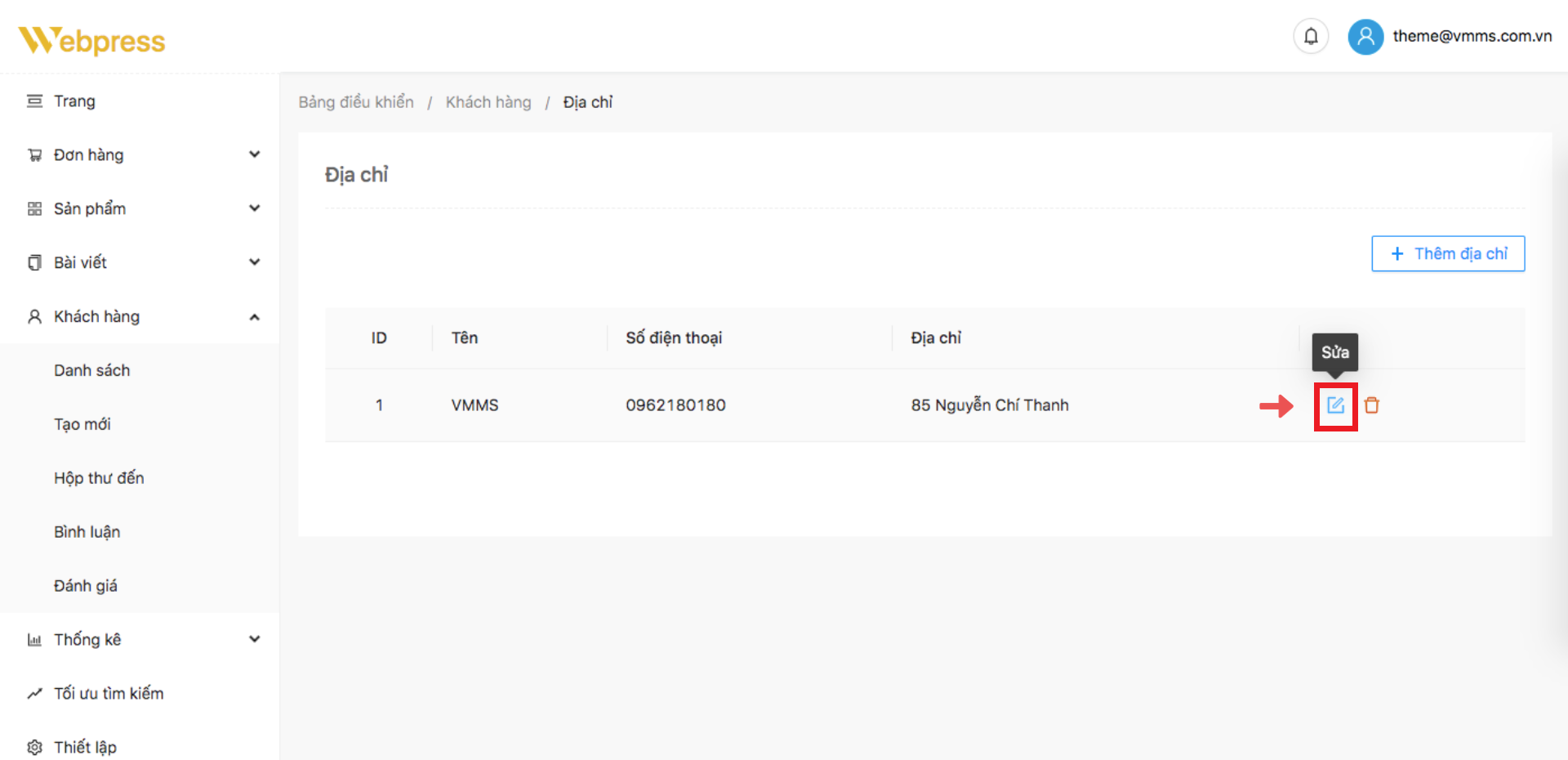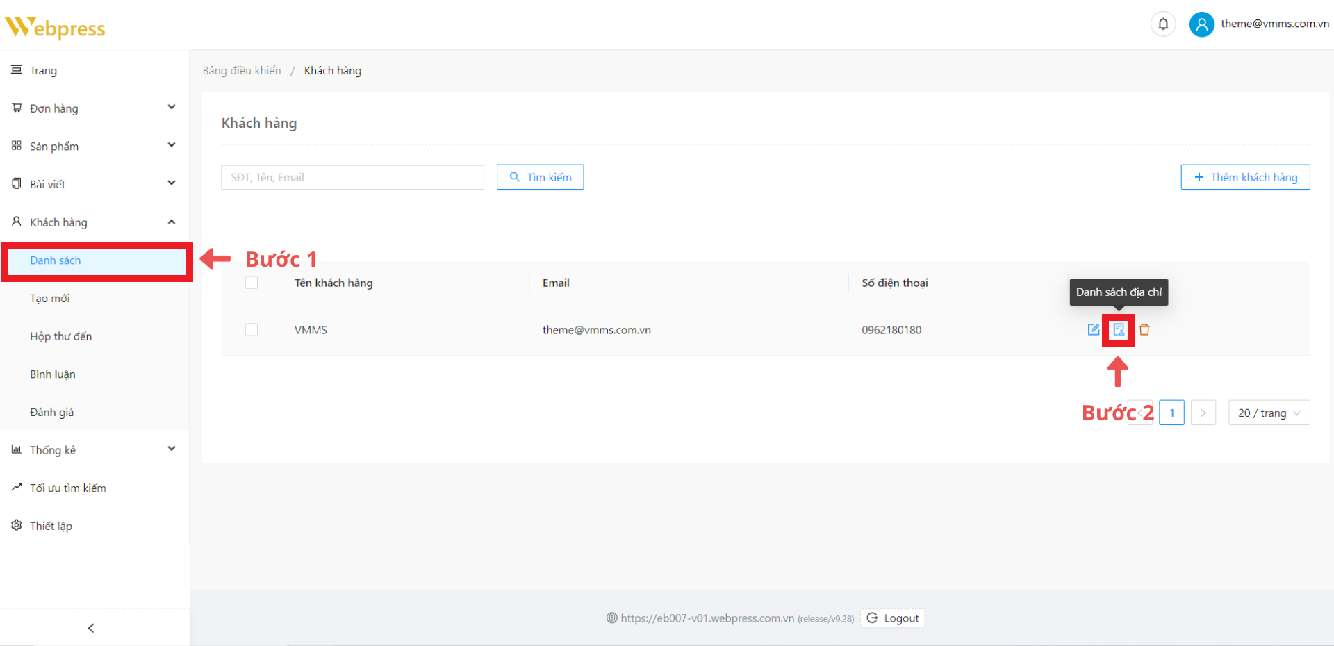 Bước 1: Ở danh mục “Khách hàng”, khi muốn chỉnh sửa địa chỉ khách hàng, chọn “Danh sách” ➞ lựa chọn khách hàng muốn chỉnh sửa địa chỉ, chọn “Danh sách địa chỉ”