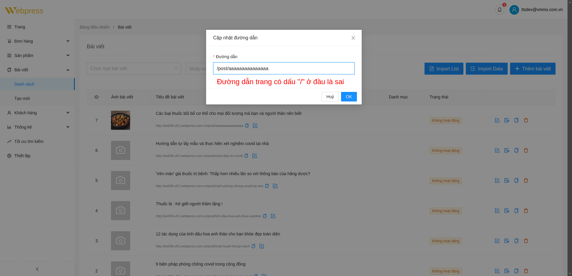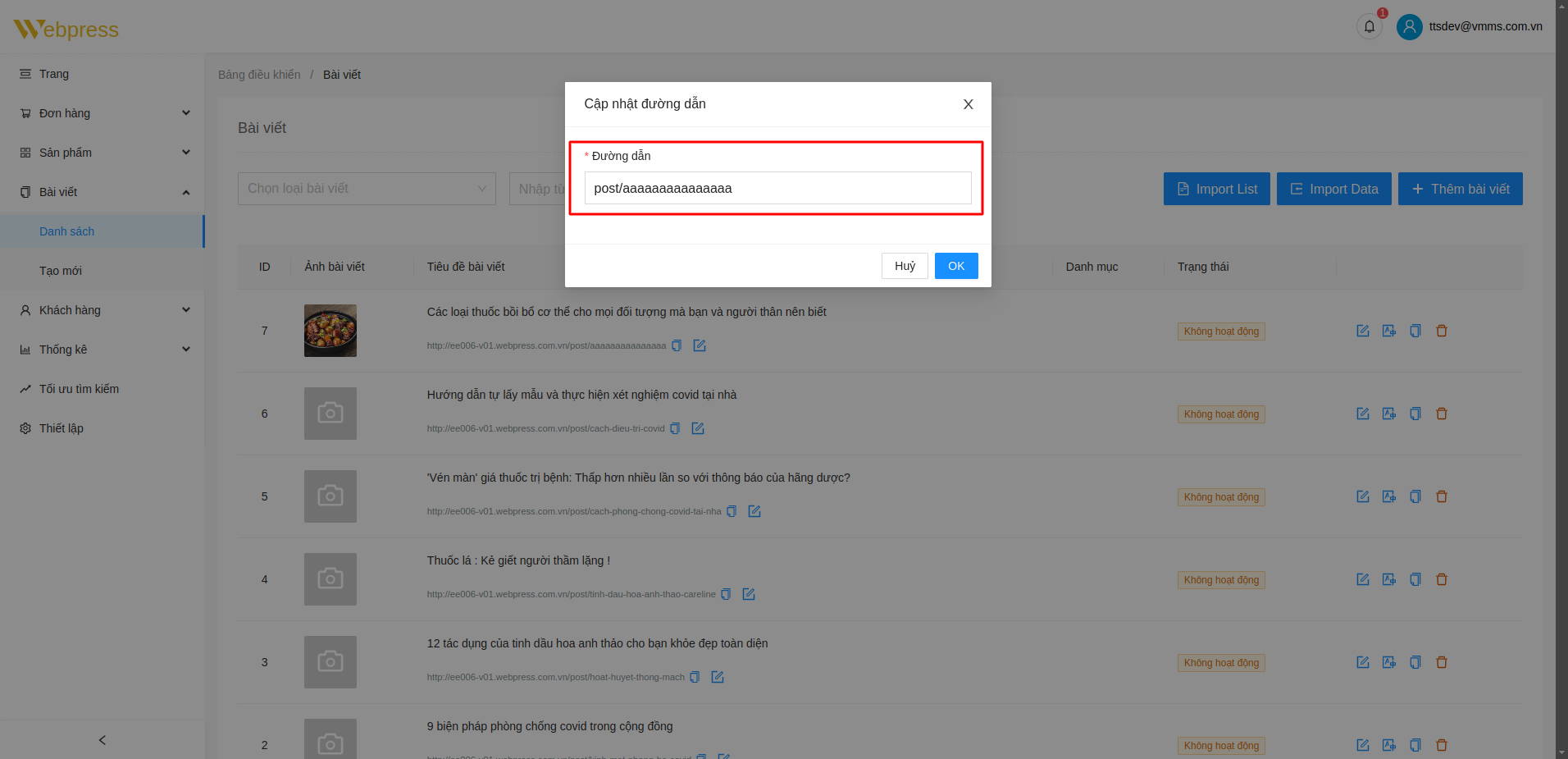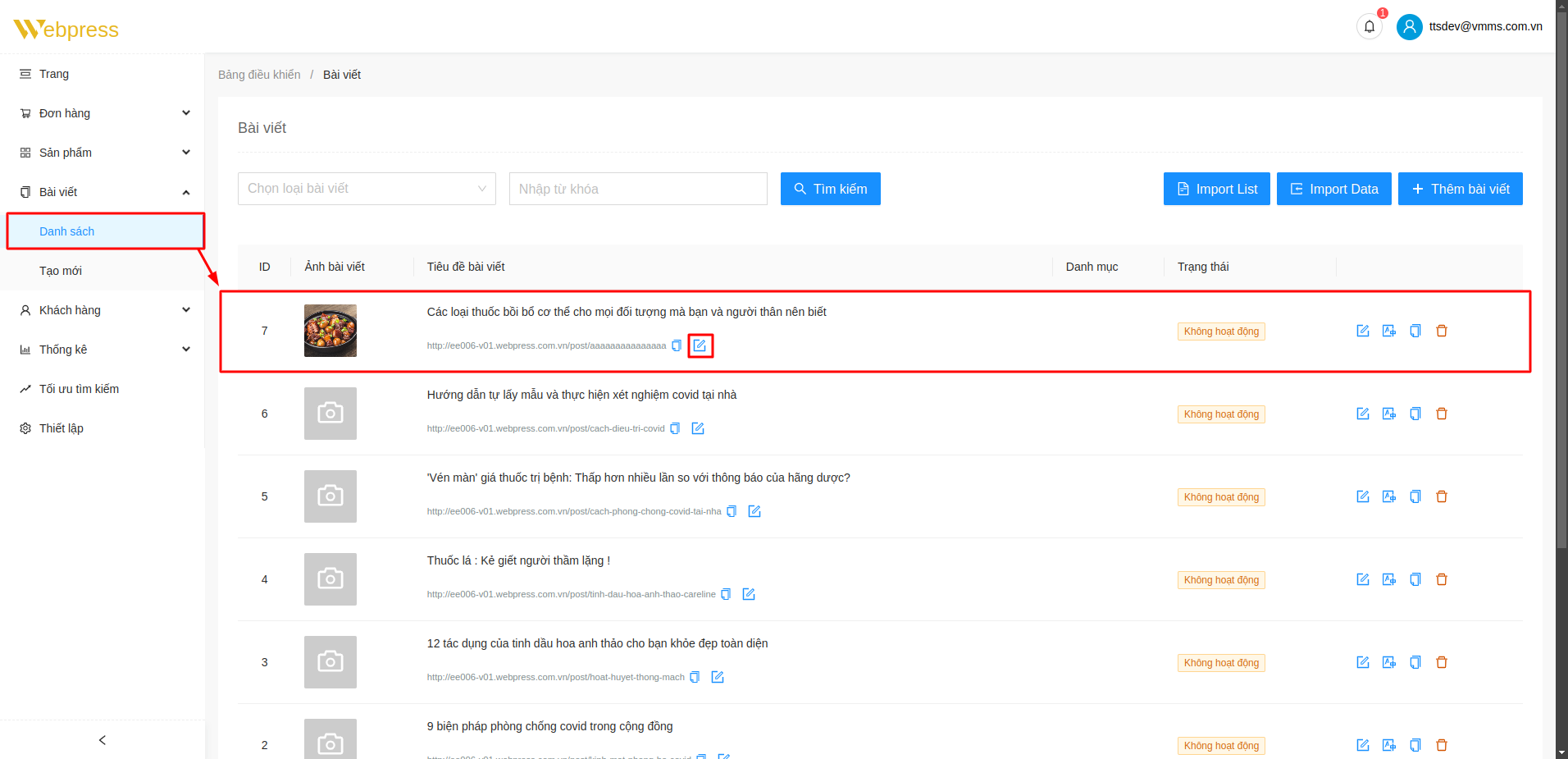 Bước 1: Để chình sửa đường dẫn cho bài viết, vào "Danh sách" trong mục "Bài viết", chọn icon "Chỉnh sửa đường dẫn"