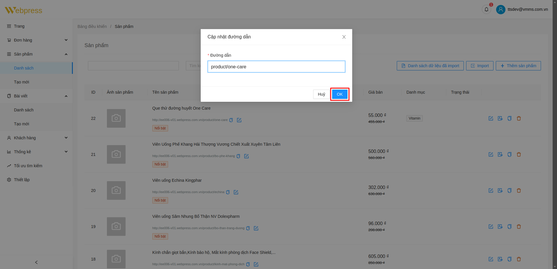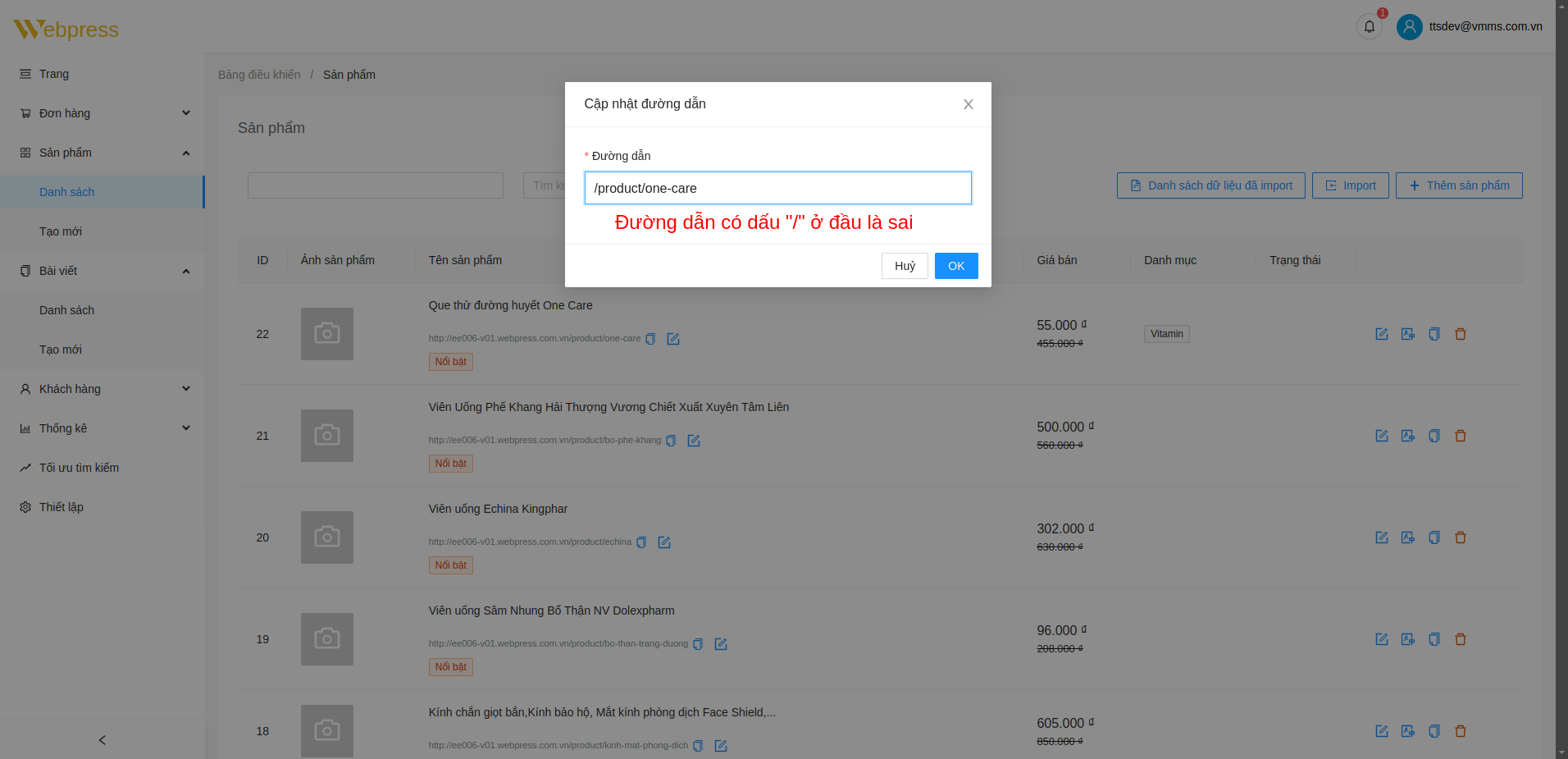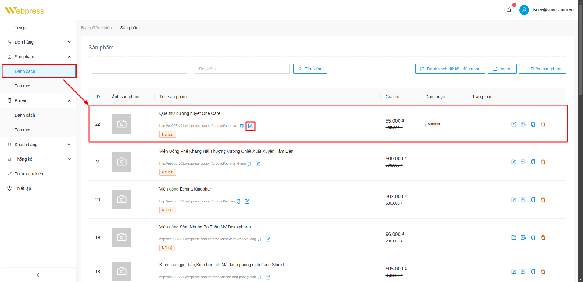 Bước 1: Để chình sửa đường dẫn cho bài viết, vào "Danh sách" trong mục "Sản phẩm", chọn icon "Chỉnh sửa đường dẫn"