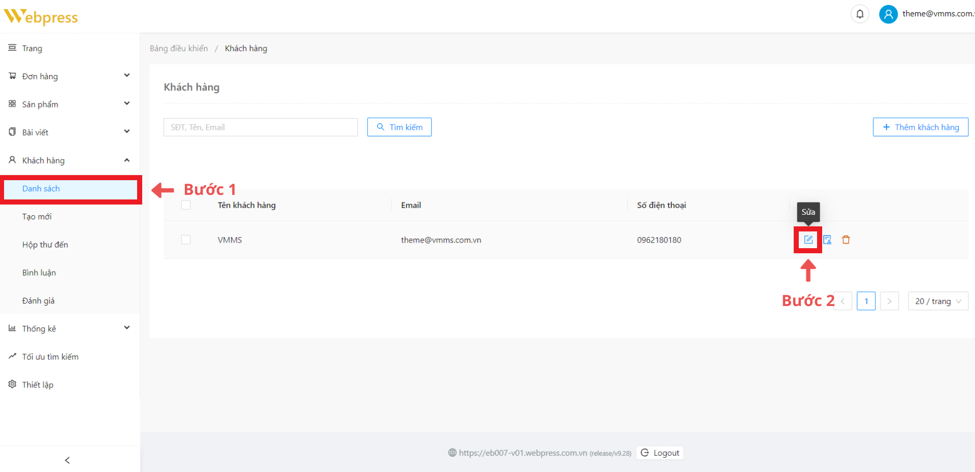 Bước 1: Ở danh mục “Khách hàng”, khi muốn chỉnh sửa thông tin khách hàng, chọn “Danh sách” ➞ lựa chọn khách hàng muốn chỉnh sửa thông tin, chọn “Sửa”