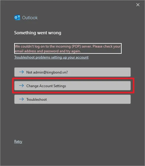 Nếu Outlook không kết nối được và hiện thống báo như sau, bạn hãy thực hiện 1 số cấu hình thêm trong mục Change Account Settings như sau: