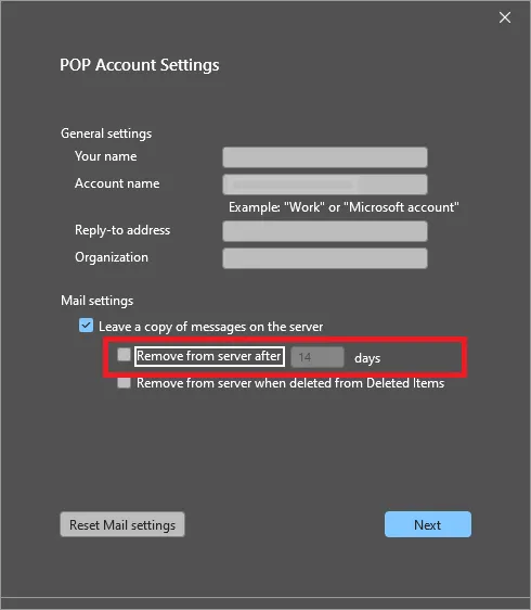 Bạn bỏ tích cho ô Remove from server after 14 days