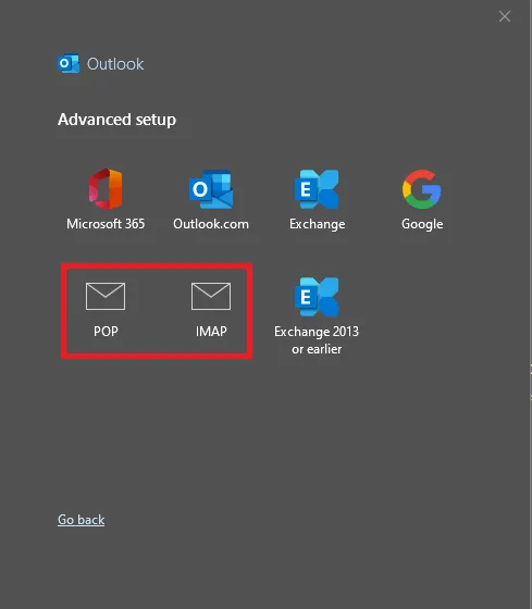 Bước 2: Khi bảng Advanced Setup xuất hiện, bạn chọn POP hoặc IMAP tuỳ vào cách sử dụng tại doanh nghiệp của bạn. Ở đây, VMMS sẽ chọn POP
