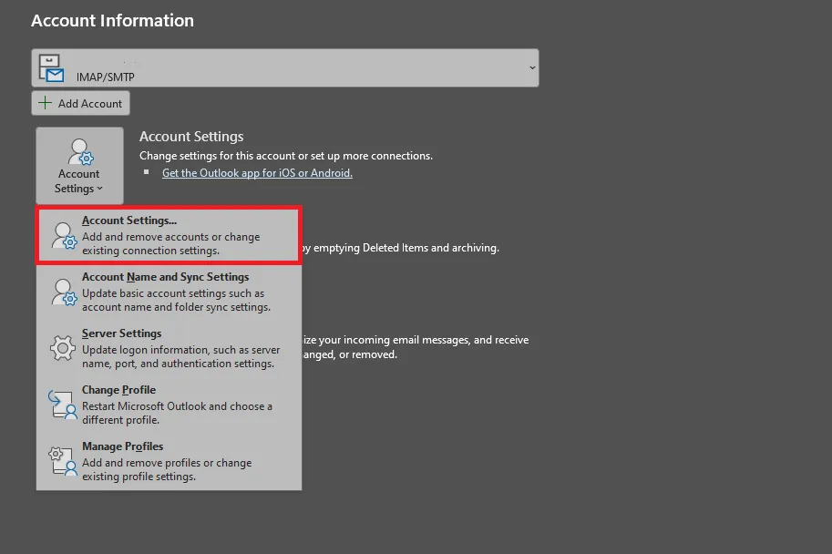 Bước 1: Trên ứng dụng Outlook, vào File, chọn Account Settings