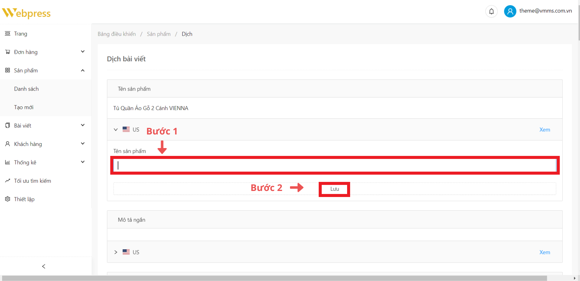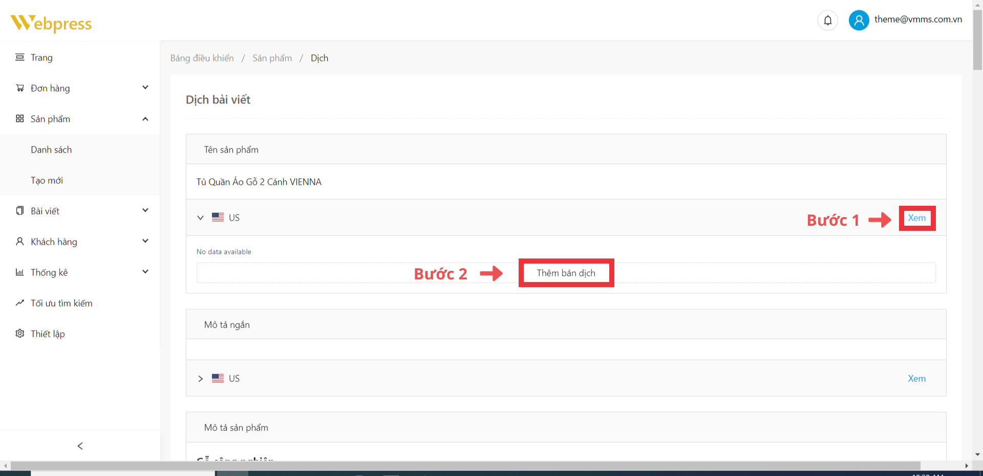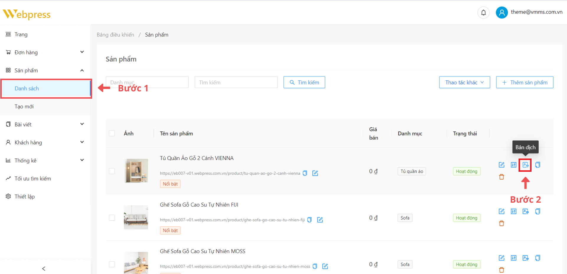 Bước 1: Ở danh sách sản phẩm, chọn sản phẩm muốn thêm ngôn ngữ và click vào icon “Bản dịch”