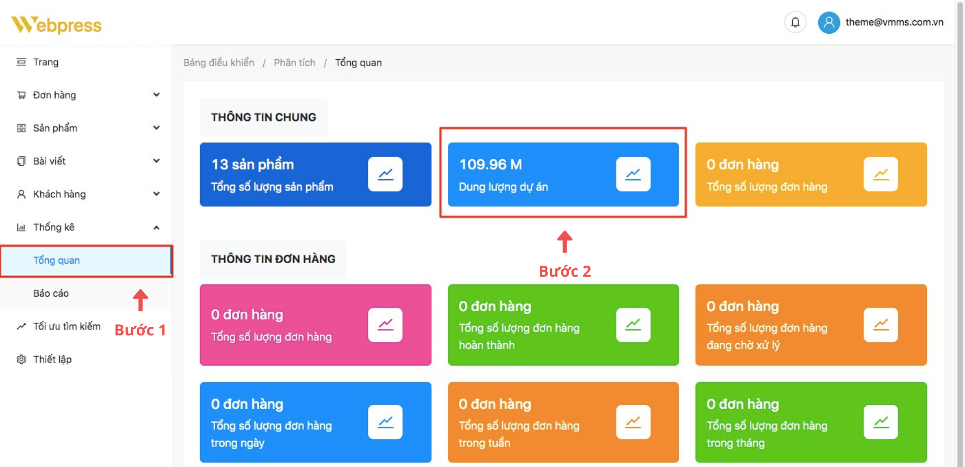 Bước 1: Ở danh mục “Thống kê", khi muốn xem dung lượng website, chọn “Tổng quan" ➞ quan sát khối “Dung lượng dự án”