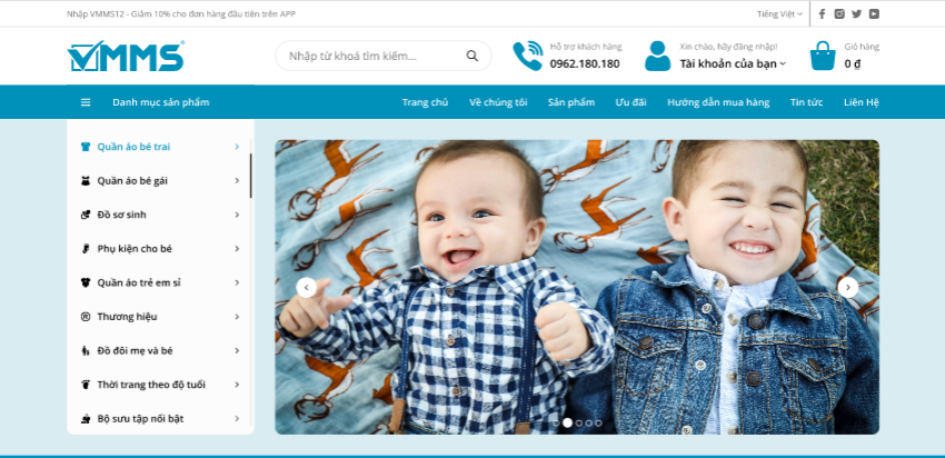 Giao diện website thời trang trẻ em được thiết kế dành riêng cho cửa hàng kinh doanh thời trang trẻ em. Với thiết kế linh hoạt, giao diện dễ dàng tùy biến phù hợp với các ngành nghề kinh doanh khác như: thời trang nam, nữ, cửa hàng giày, cửa hàng túi xách,….