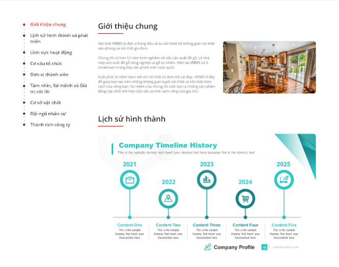 Lịch sử hình thành - Phần này để khách hàng biết quá trình hình thành và phát triển của công ty bạn. Những dấu mốc và giải thưởng doanh nghiệp đạt được cũng là yếu tố để khách hàng tin tưởng công ty hơn.