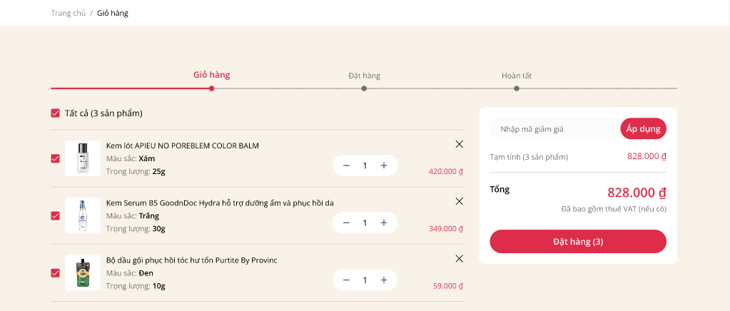 Một tình năng quan trọng của các mẫu web bán hàng mỹ phẩm đó chính là tính năng đặt hàng online và thanh toán trực tuyến. Khách hàng có thể thêm, xóa các sản phẩm nằm trong giỏ hàng của mình. Sau khi chọn lựa đầy đủ mỹ phẩm cần mua, giỏ hàng sẽ báo tổng số tiền phải thanh tóa. Khung đặt hàng được thiết kế hiện đại, với form đặt hàng đơn giản. Thông tin đặt hàng mua mỹ phẩm, sản phẩm làm đẹp của khách được gửi trực tiếp đến email quản trị viên trang web bán hàng mỹ phẩm.
