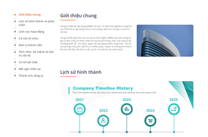 Lịch sử hình thành - Phần này để khách hàng biết quá trình hình thành và phát triển của công ty bạn. Những dấu mốc và giải thưởng doanh nghiệp đạt được cũng là yếu tố để khách hàng tin tưởng công ty hơn.