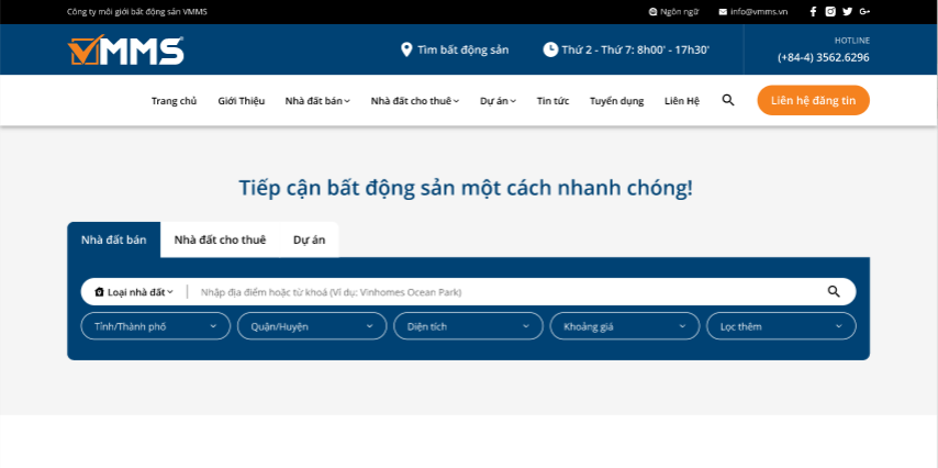 Khách hàng dễ dàng tìm thấy được dự án mong muốn dựa trên thanh công cụ tìm kiếm và bộ lọc nâng cao phân loại theo từ khóa, phân loại dịch vụ nhà đất, phân loại theo địa chỉ (Tỉnh/Huyện...), phân loại diện tích, phân loại mức giá…