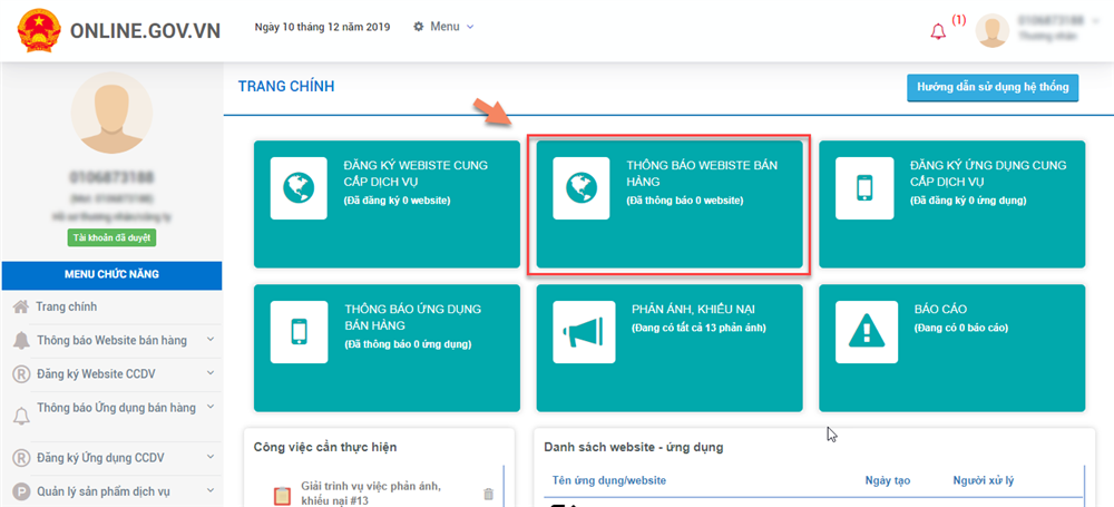 - Sau khi đăng nhập, Quý vị chọn menu "THÔNG BÁO WEBSITE" bên phía tay trái, sau đó chọn mục "Thêm mới thông báo website". Hoặc Quý vị có thể chọn biểu tượng thông báo website trong mục LIÊN KẾT NHANH như hình dưới đây: