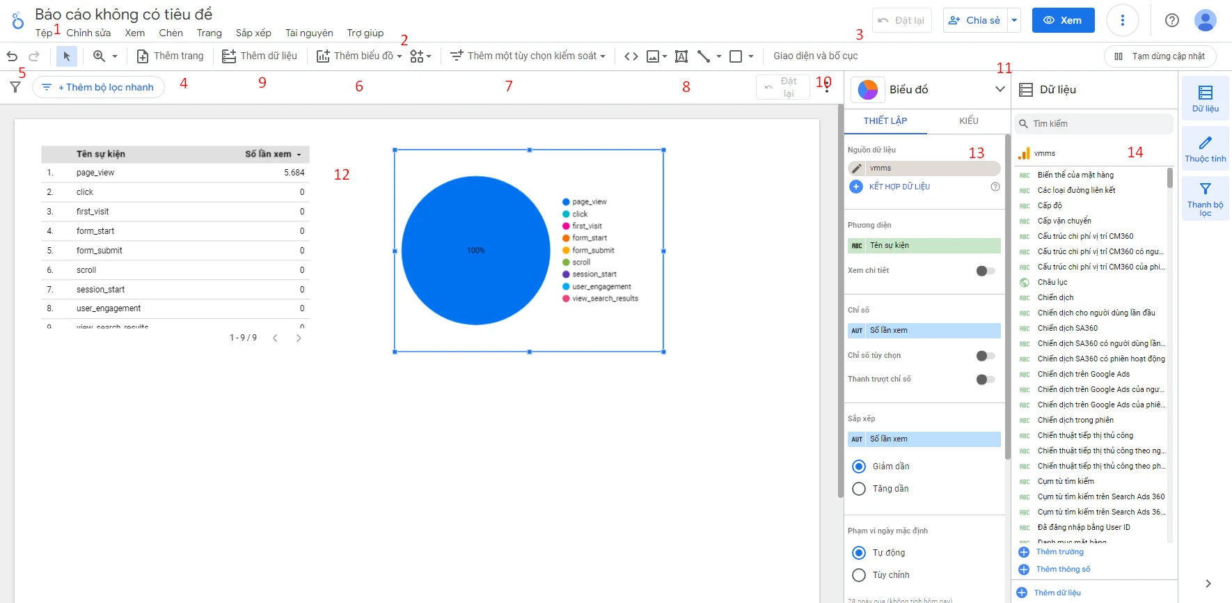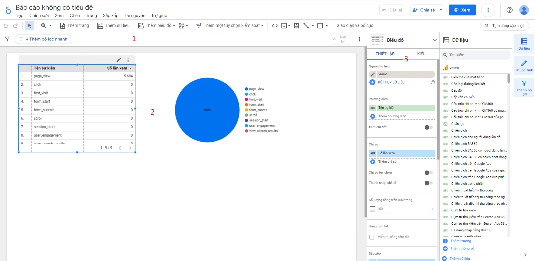 Các trường có sẵn. Bạn có thể kéo thứ nguyên và số liệu vào bảng thuộc tính dữ liệu.