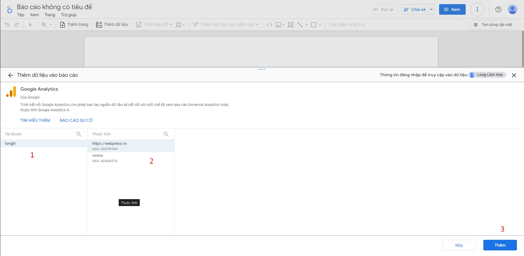 Hướng dẫn liên kết nguồn dữ liệu Google Analytics để tạo báo cáo Google Analtyics.