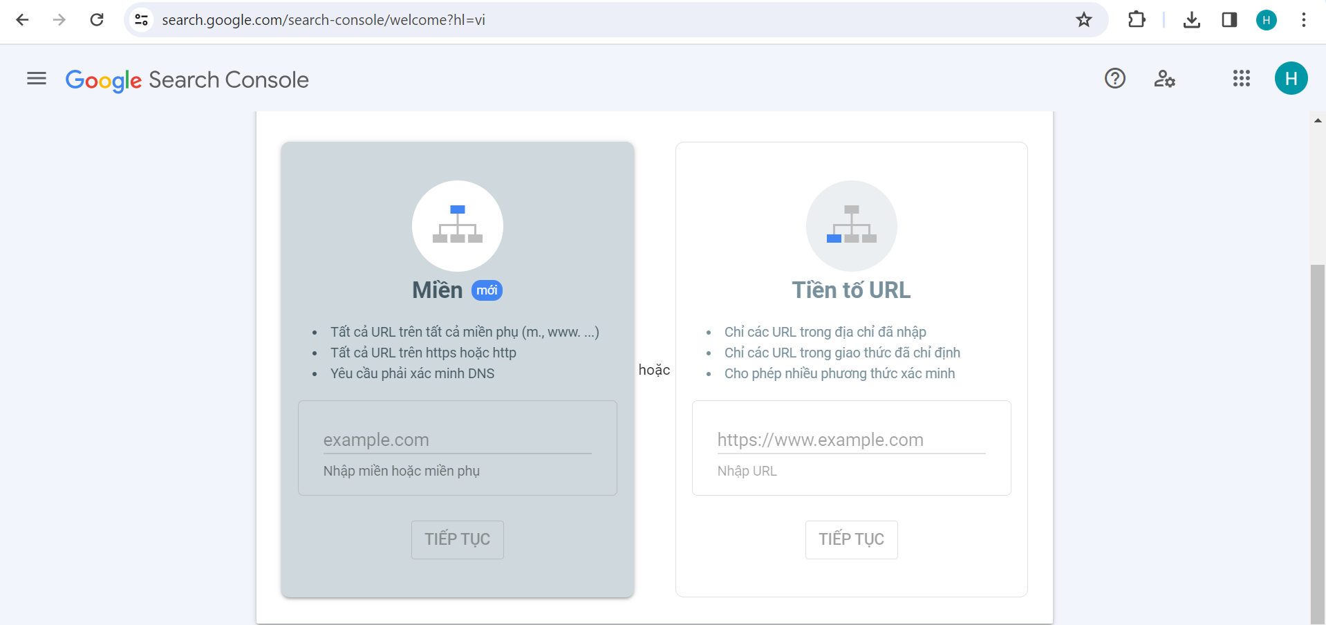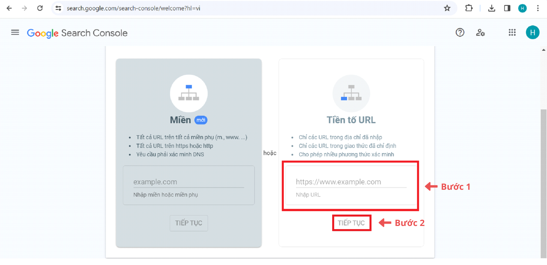 Bước 1: Truy cập vào đường link: https://search.google.com/search-console/welcome?hl=vi