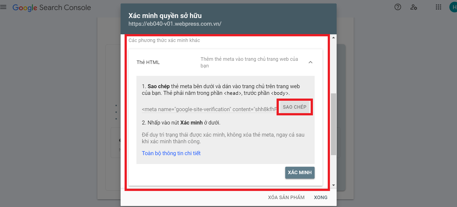 Bước 3: Ở hộp “Xác minh quyền sở hữu”, tìm đến mục “Thẻ HTML”, chọn “Sao chép” để sao chép thẻ meta.