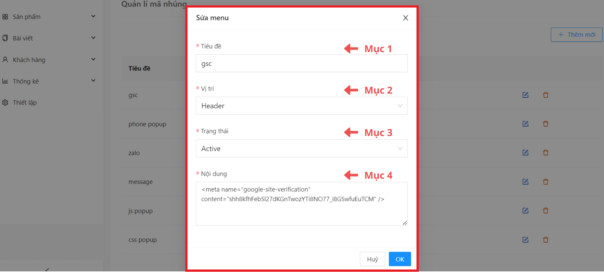 Bước 4: Ở trang quản trị, chọn danh mục “Thiết lập” → chọn “Quản lý mã nhúng”.